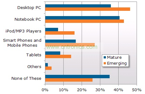 NPD DisplaySearch全球電視消費者換機調查還對家庭戶進行了關于在其他設備上收看電視視頻節目的調研,發現在新興市場越來越多的家庭使用除電視以外的設備,包括平板電腦、智能手機和MP3播放器。