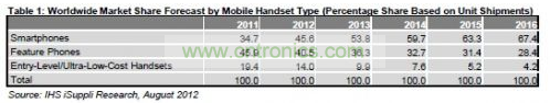 今年智能手機(jī)出貨與與市場(chǎng)份額強(qiáng)勁擴(kuò)張,將首次成為領(lǐng)先的手機(jī)類型,而且未來(lái)幾年出貨量將保持兩位數(shù)的增長(zhǎng)速度。到2016年,智能手機(jī)將占總體手機(jī)市場(chǎng)的67.4%,如表1所示。