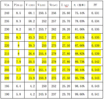 下面舉一個實測的結果為例,這是一個80顆3014串聯的球泡燈,采用了5顆Semitek 的S-562T并聯。它在不同的輸入市電電壓時,所測得的結果如下表所示。