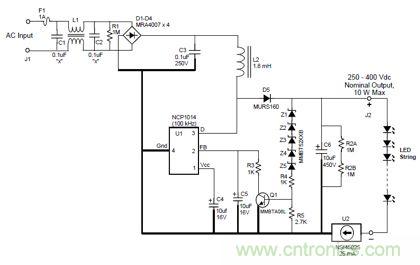美國安森美公司加了一個功率因素校正芯片NCP1014的恒流二極管的電源,其電原理圖見圖12。