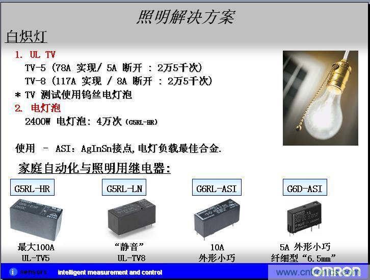 我們實際客戶應用的案例,我們在推廣客戶的過程中,形成了一些實際的應用案例,在實現照明系統和家電自動化的領域,在節能領域、自動化的領域現在是越來越高了,目前歐姆龍的繼電器在日光燈這塊直接的應用可以運用繼電器作為啟用的電阻。繼電器也就是高級一點的器開關。在模塊上面,也是用來控制鎮流器的。在另外一個人體、物體探照這塊,我們也會有MEMS非接觸系統的微溫度傳感器。按照設計的過程中,就是在信號繼電器和MEMS非接觸溫度傳感器繼電器上都有應用,但是還沒有成功案例,所以上面就打了問號。