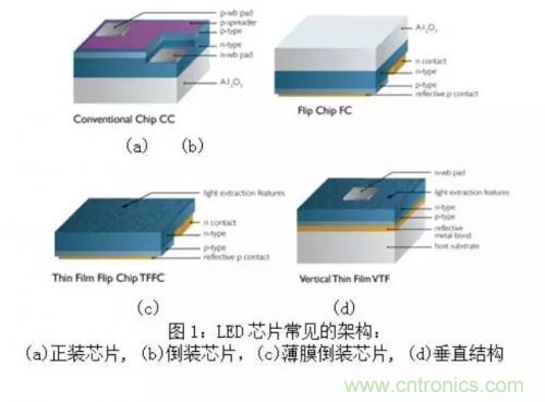 基于氮化鎵的藍(lán)/白光LED的芯片結(jié)構(gòu)強(qiáng)烈依賴(lài)于所用的襯底材料。目前大部分廠(chǎng)商采用藍(lán)寶石作為襯底材料,芯片結(jié)構(gòu)主要分為4類(lèi),如圖1所示: