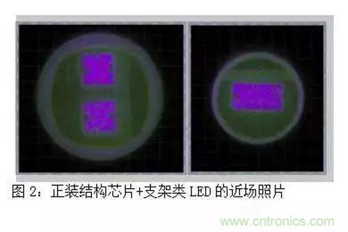 這類(lèi)芯片廣泛被中低功率的封裝產(chǎn)品所采用,優(yōu)點(diǎn)是價(jià)格低;缺點(diǎn)是由于藍(lán)寶石導(dǎo)熱性能差,所以芯片散熱較差,P型材料的導(dǎo)電性也較差,因此注入電流受到限制。此外,芯片是五面發(fā)光的,通常需要將將芯片置于支架內(nèi),如圖2所示,反光杯的開(kāi)口面積遠(yuǎn)大于芯片發(fā)光面積,導(dǎo)致單位面積光通量低,芯片表面顏色均勻性非常差,芯片正上方偏藍(lán),而外圈偏黃。這就是在使用中,如射燈、平板燈等,出現(xiàn)黃圈的原因。