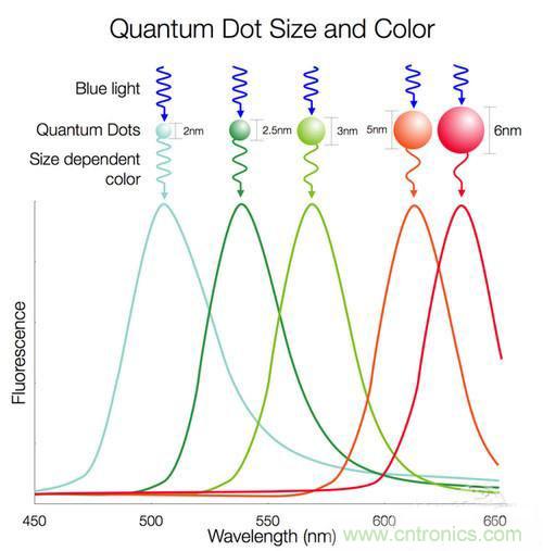 簡(jiǎn)單通俗的說(shuō),量子點(diǎn)的光電性質(zhì)與以往的發(fā)光顯示顆粒大不一樣,量子點(diǎn)因?yàn)轭w粒非常小,以納米為單位,導(dǎo)致量子點(diǎn)的顯示顏色是以改變顆粒的大小形狀而進(jìn)行改變,也正因?yàn)槿绱耍碚撋蟻?lái)講,量子點(diǎn)顯示的色譜更具有連續(xù)性,成本也會(huì)更低。