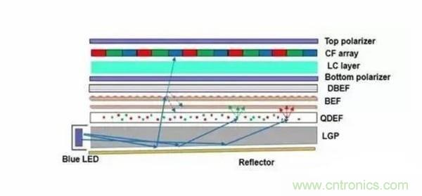 與此同時(shí),QDEF層連擺放位置很計(jì)較,為了讓光在層層光學(xué)膜中旅行時(shí),重復(fù)反射通過(guò)QDEF的次數(shù)增多,所以QDEF還得放在離光源最近的地方,一但順序往上移,紅綠光的轉(zhuǎn)換不足,就會(huì)造成偏藍(lán)的現(xiàn)象。