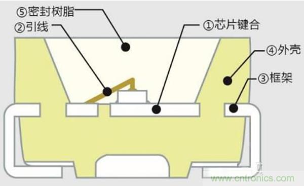 一直以來,存在元件晶片鍵合*2)所用的焊膏部位變黑導(dǎo)致LED發(fā)光強度降低的問題。但是,新開發(fā)LED的結(jié)構(gòu)與部件,羅姆采用從元件到封裝的垂直統(tǒng)合型生產(chǎn)體制,芯片鍵合、引線、框架每個部位均可采取抗硫化措施。