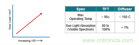 為了更好地理解為什么散射屏具有優勢,我們不妨來看看散射屏與傳統TFT面板的物理特性(圖4)。散射屏具有的兩大主要優勢在于可在更高的溫度中工作,此外散射屏不會吸收大量的太陽入射可見光譜,這一點更加重要。(光譜的紅外[IR]和紫外[UV]部分很容易被過濾。)