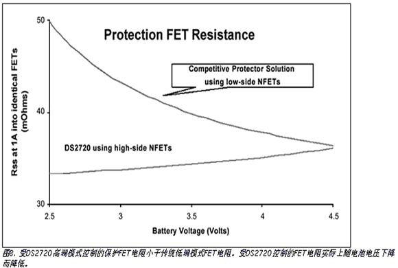 DS2720IC使用外部開關元件,如低成本n溝道功率MOSFET,來控制充電和放電電流。內部9V的電荷泵為外部n溝道MOSFET提供高端驅動,與常見使用相同FET的低端保護電路相比具有更低的導通電阻。FET導通電阻實際上隨電池放電而減少(見圖8)。