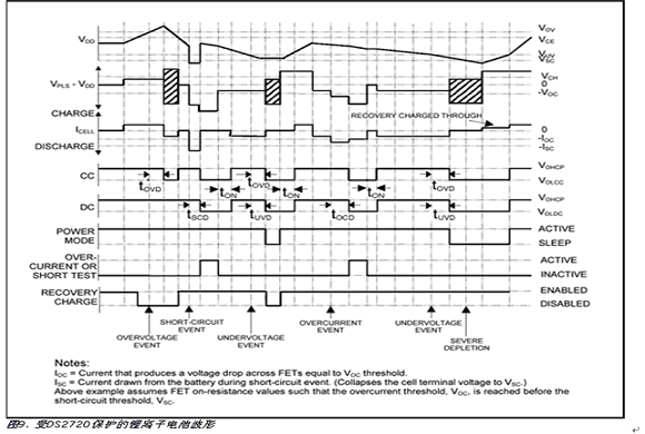 a 過壓 如果在VDD檢測的電池電壓超過過壓閾值VOV時間大于過壓延遲時間tOVD,則DS2720關閉充電FET,并將保護寄存器的OV置位。在過壓期間,放電通路保持開放。除非被另外保護條件鎖定,當電池電壓降到充電使能閾值VCE以下或由于放電導致VDD-VPLS>VOC時,充電FET被重新使能。