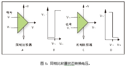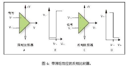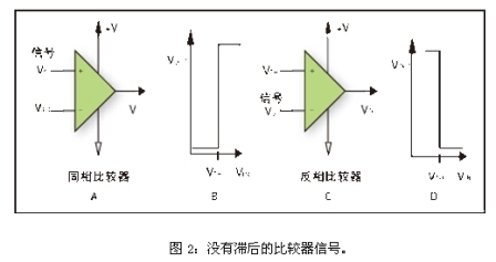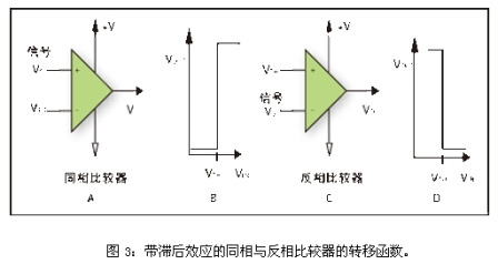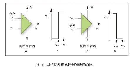 圖1B和1D給出了比較器電路的轉換函數。同相比較器被定義為在輸入信號大于門限電壓時輸出為正的比較器,而反相比較器被定義為輸入信號大于門限電壓時輸出為負的比較器。