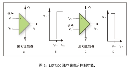 LMP7300的滯后值受控于VREF電壓和施加于HYSTP和HYSTN引腳電壓之間的電壓差。圖7A和7D顯示了兩種可能的滯后連接。如果一個滯后引腳被直接連接到VREF電壓,那部分滯環就會被刪除。參考圖6,滯后電壓值約為20mV: