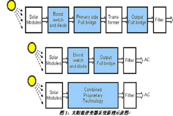 光電逆變器的一般結構如圖1所示,有三種不同的逆變器可供選擇。太陽光照射在通過串聯方式連接的太陽能模塊上,每一個模塊都包含了一組串聯的太陽能電池(Solar Cell)單元。太陽能模塊產生的直流 (DC) 電壓在幾百伏的數量級,具體數值根據模塊陣列的光照條件、電池的溫度及串聯模塊的數量而定。