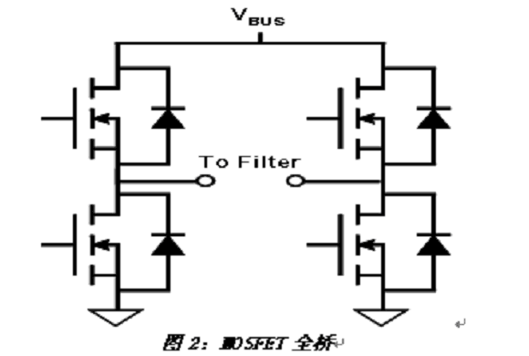 濾波之后,輸出橋產生一個50Hz的正弦電壓及電流信號。一種常見的實現方案是采用標準全橋結構 (圖2)。圖中若左上方和右下方的開關導通,則在左右終端之間加載一個正電壓;右上方和左下方的開關導通,則在左右終端之間加載一個負電壓。