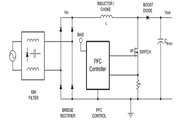 [圖中文字:電感/扼流線圈、升壓二極管、PFC控制器、功率開關、橋式整流器、PFC控制、EMI濾波器]