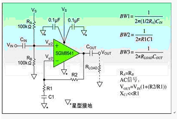 首先,電路的電源抑制幾乎沒有,電源電壓的任何變化都將直接通過兩個(gè)分壓電阻改變偏置電壓Vs/2,但電源抑制的能力是電路非常重要的特性。例如此電路的電源電壓1伏的變化,能引起偏置電路電壓的輸出Vs/2變化0.5伏。該電路的電源抑制僅僅只有6dB,通過選用SGM8541運(yùn)算放大器可以增強(qiáng)電源抑制能力。