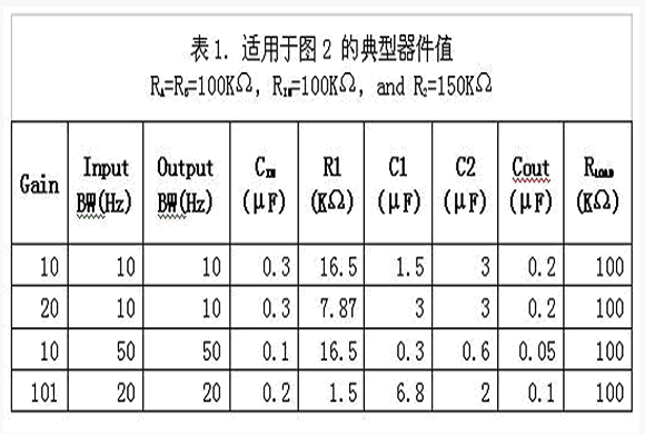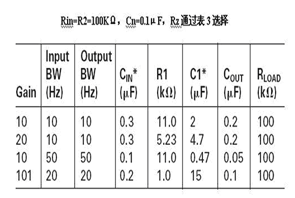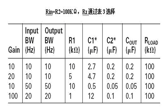 設(shè)計(jì)單電源運(yùn)算放大器電路,需要考慮輸入偏置電流誤差、電源抑制、增益、以及輸入與輸出線路帶寬等等。然而普通的應(yīng)用設(shè)計(jì)是可以通過查表來獲得,見表1。在單電源電壓為15V或12V時(shí)偏置分壓的兩個(gè)電阻通常選用100kΩ,這樣可以在電源消耗與輸入偏置電流誤差之間合理的折中。5V單電源偏置分壓電阻減小到一個(gè)比較低的值,例如42kΩ。還有些在3.3V應(yīng)用中偏置分壓電阻選在27kΩ左右。