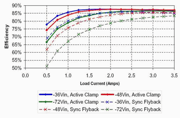 有源鉗位所提供的所有這些小小的改進都會對效率產生很大的影響。圖 7 顯示了在最小、額定及最大輸入電壓值時測量得出的兩種設計的效率。在所有線電壓情況下,有源鉗位設計將最大負載效率提高了 2% 左右。在輕負載的情況下,這種區別更位明顯。額定線電壓及輕負載情況下,效率提升超過了 12%,這對于長時間處于空閑模式的系統來說是很重要的。大部分效率提升都來自漏極電感能量的恢復,漏極電感能量耗散通常發生在緩沖器中,并減少了同步 FET Q1 直通帶來的損耗。