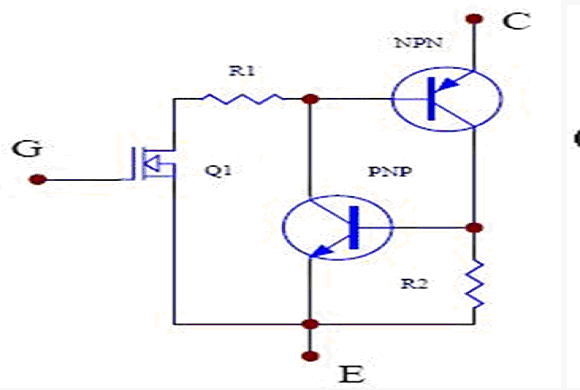 IGBT 有一定抗過電流能力,但必須注意防止過電流損壞。IGBT 復(fù)合器件內(nèi)有一個寄生晶閘管,所以有擎住效應(yīng)。圖5 為一個IGBT 的等效電路,在規(guī)定的漏極電流范圍內(nèi),NPN 的正偏壓不足以使NPN 晶體管導(dǎo)通,當(dāng)漏極電流大到一定程度時,這個正偏壓足以使NPN 晶體管開通,進(jìn)而使NPN 和PNP 晶體管處于飽和狀態(tài),于是寄生晶閘管開通,門極失去了控制作用,便發(fā)生了擎住效應(yīng)。IGBT 發(fā)生擎住效應(yīng)后,漏極電流過大造成了過高的功耗,最后導(dǎo)致器件的損壞。