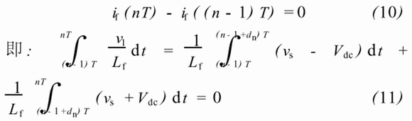 單相電壓源型有源濾波器直流側(cè)以電容作為儲能元件來維持直流電壓Vdc恒定。設(shè)開關(guān)周期恒定為T,第n個開關(guān)周期內(nèi)占空比為dn,則這個開關(guān)周期內(nèi)兩對開關(guān)管分別導通的時間為dn*T和(1-dn)*T,從而分別可以得到兩個電壓平衡方程: