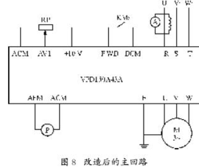 由于這是對舊設備進行改造,所以在改造中充分考慮并照顧操作人員的操作習慣,保持原有的工作順序不變。根據操作人員的實際需要,重新設計了主回路及控制回路。用電位器給定頻率,控制電動機的轉速,實現無級調速。用一轉速表顯示電動機的實際轉速,給操作人員提供可靠的操作依據。