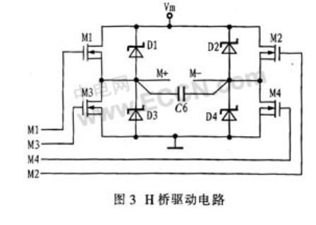 相對來說,利用2個N溝道功率MOSFET和2個P溝道功率MOSFET驅動電機的方案,控制電路簡單、成本低。但由于加工工藝的原因,P溝道功率MOSFET的性能要比N溝道功率MOSFET的差,且驅動電流小,多用于功率較小的驅動電路中。而N溝道功率MOSFET,一方面載流子的遷移率較高、頻率響應較好、跨導較大;另一方面能增大導通電流、減小導通電阻、降低成本,減小面積。綜合考慮系統功率、可靠性要求,以及N溝道功率MOSFET的優點,本設計采用4個相同的N溝道功率MOSFET的H橋電路,具備較好的性能和較高的可靠性,并具有較大的驅動電流。其電路圖如圖3所示。圖中Vm為電機電源電壓,4個二極管為續流二極管,輸出端并聯一只小電容C6,用于降低感性元件電機產生的尖峰電壓。