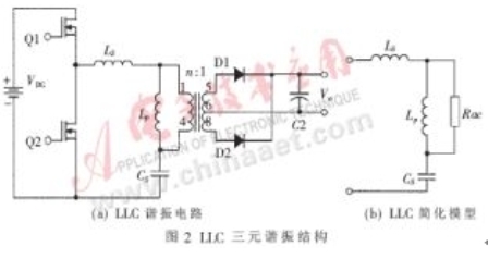 在二元件諧振網絡的基礎上,根據不同的應用可構建不同種類的三元件的諧振網絡。三元件諧振網絡與二元件諧振網絡相比有很多優點,比如在全負載范圍內都具有較高的轉換效率,而且頻率變化范圍比較窄等。本文主要介紹和分析由三元件LLC構成的諧振網絡,其結構如圖2(a)所示。