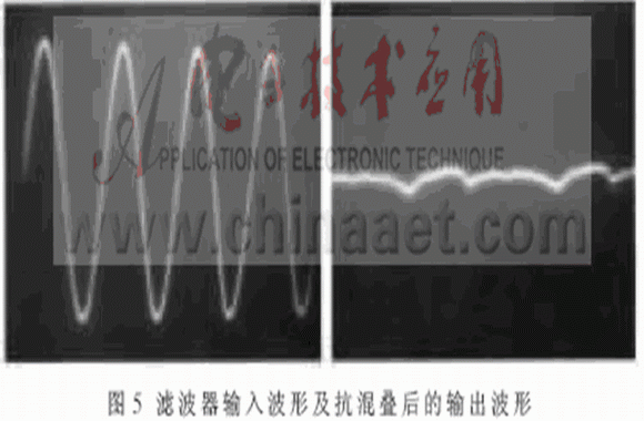 實驗觀察得知,經過開關電容濾波后的信號存在較多的“毛刺”和“陰影”。分析發現,這主要是高頻混疊所致。本文作者通過大量的實驗探索提出了在開關電容帶阻濾波電路的輸出端接入抗混疊濾波器的精簡解決方法,采用一階低通濾波器實現抗混疊濾波。同時,接入的抗混疊濾波器還起到消除開關噪聲、時鐘噪聲等高頻干擾和平滑濾波的目的。濾波器輸入波形及輸出波形如圖5所示。