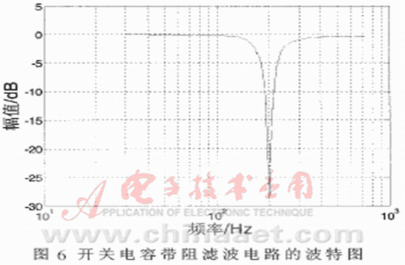 根據實驗數據繪制的開關電容帶阻濾波器的波特圖如圖6所示。