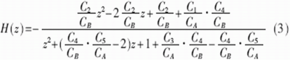 給定雙二階連續時間帶阻濾波器的電路圖如圖3,用開關電容來替代電阻后得到開關電容帶阻濾波電路(圖4),利用式(2)推導出圖4電路的離散時間傳遞函數為: