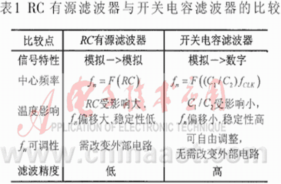 開關電容濾波器與RC有源濾波器比較如表1所示。傳統濾波器的中心頻率與電阻和電容有關,兩者的微小變化都會引起中心頻率出現較大偏移。開關電容濾波器可以自由調整中心頻率,且當電容值隨溫度發生漂移時,兩個電容值同向改變,維持了電容比值的穩定,使得中心頻率具有很高的溫度穩定性。