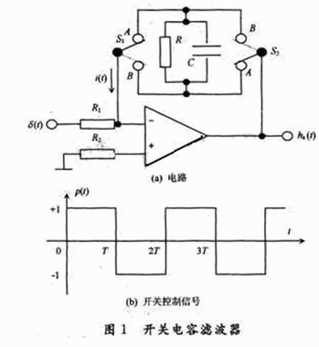 開關電容有源濾波器電路如圖1(a),其中S1和S2是由周期為2T的方波信號控制的理想電子開關,方波控制信號p(t)波形如圖1(b),其占空系數為0.5。即在2kT<t<(2K+1)T期間兩開關接通A點,在(2K+1)T<t<(2K+2)T期間兩開關接通B點,其中K=0,1,2,…,是時段編號。