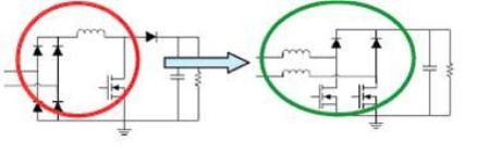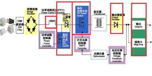 能效規范對電路段的挑戰主要體現在PFC能效、主轉換器能效和次級能效幾個方面。要提高這幾個方面的能效,就必須改善如圖1所示電路紅色框中的元件性能。以下將介紹改善電路段能效的幾種方法。
