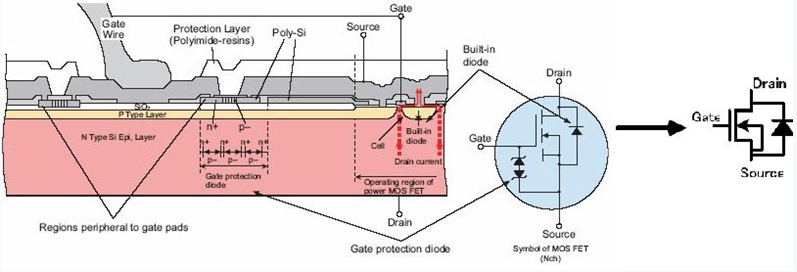 在MOS管原理圖上可以看到,漏極和源極之間有一個寄生二極管。這個叫體二極管,在驅(qū)動感性負(fù)載(如馬達),這個二極管很重要。順便說一句,體二極管只在單個的MOS管中存在,在集成電路芯片內(nèi)部通常是沒有的。下圖是MOS管的構(gòu)造圖,通常的原理圖中都畫成右圖所示的樣子。 (柵極保護用二極管有時不畫)