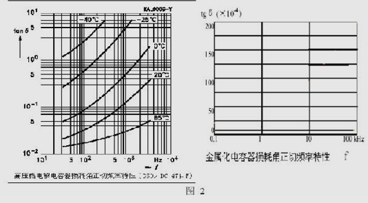 而鋁電解電容器的損耗非常大,其中用功損耗可以占到總無(wú)功容量的20%,且鋁電解電容器有功損耗隨著頻率的增大而增大,頻率超過(guò)1000赫茲損耗變化率逐漸增大,當(dāng)頻率超過(guò)10000赫茲后變化率急劇增加,有功損耗增大,發(fā)熱量增大。圖2中顯示了鋁電解電容器損耗頻率特性(國(guó)外某著名鋁電解電容器生產(chǎn)公司提供),這也正是長(zhǎng)久以來(lái)在中、高頻大功率環(huán)境下采用鋁電解直流濾波電容器發(fā)熱量大、故障率高的根本原因。而金屬化電容器固有損耗非常小,整臺(tái)電容器損耗小于2‰,僅為鋁電解電容器1%,且采用聚丙烯薄膜作為介質(zhì),產(chǎn)品頻率特性很穩(wěn)定,如圖2所示,故在中、高頻環(huán)境下采用金屬化直流濾波電容器,可以大幅度降低線路損耗,避免發(fā)熱,穩(wěn)定性非常高。