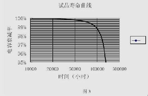 根據(jù)上述因素,鋁電解電容器在中、高頻環(huán)境下使用故障率非常高、壽命非常短,額定工況下預(yù)期壽命≤50000小時(shí)(如圖3),隨著工況的變化容量急劇變化,壽命降低,甚至由一些企業(yè)在中、高頻環(huán)境使用鋁電解電容器壽命不足10000小時(shí),常常由于電容器故障影響到整臺(tái)設(shè)備的使用。相反金屬化電容器在中、高頻環(huán)境使用,由于其良好的頻率、電流特性可以保證其安全長(zhǎng)壽命,在額定工況下預(yù)期壽命≥80000小時(shí),且在壽命期內(nèi)隨環(huán)境的變化電氣性能基本保持不變,不影響電容器的壽命(如圖3),保證配套設(shè)備運(yùn)行安全可靠。
