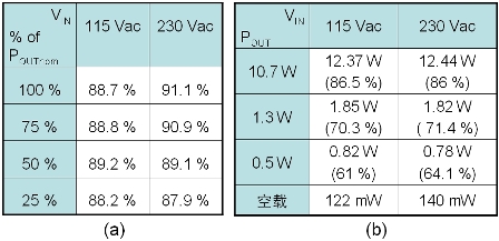 表2:NCP1380谷底開(kāi)關(guān)控制器的工作能效及待機(jī)能耗(a、工作能效;b、輕載及空載能耗)