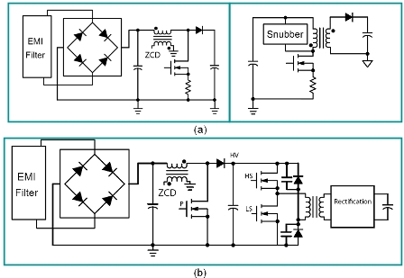 如前所述,一旦功率大于75 W,除了滿足上述工作能效及空載能耗要求外,電路中還面臨著加入PFC的要求,這在改善功率因數(shù)、使電網(wǎng)電能得到更高效利用的同時(shí),也會(huì)使得電路結(jié)構(gòu)更為復(fù)雜。在這類應(yīng)用中,傳統(tǒng)電源架構(gòu)是PFC+PWM的兩段式架構(gòu),即在非連續(xù)導(dǎo)電模式(DCM)或臨界導(dǎo)電模式(CrM)段后跟隨著準(zhǔn)諧振反激段,每個(gè)段都使用一個(gè)控制器,如圖2(a)所示。