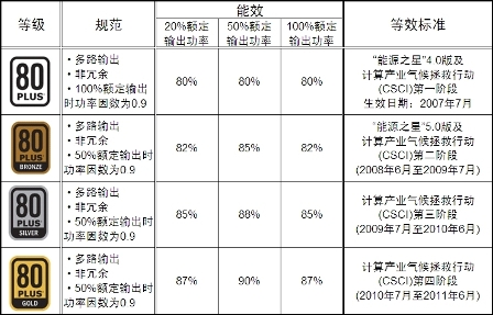 表1:80 PLUS等能效標(biāo)準(zhǔn)對(duì)多路輸出ATX電源的能效要求