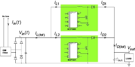 兩個(gè)DCM PFC就像一個(gè)CCM PFC轉(zhuǎn)換器,簡(jiǎn)化電磁干擾(EMI)濾波,并減小輸入電流有效值
