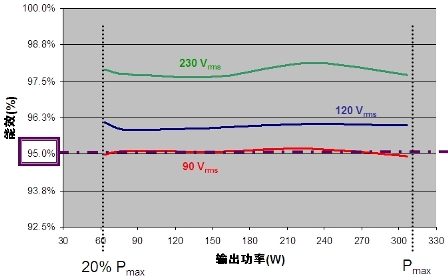 對(duì)基于安森美半導(dǎo)體NCP1601交錯(cuò)式PFC方案的寬輸入范圍、300 W PFC預(yù)轉(zhuǎn)換器進(jìn)行的測(cè)試顯示,這解決方案在很寬的負(fù)載范圍內(nèi)(從20%到100%)、90 Vrms電壓條件下實(shí)現(xiàn)95%的能效,如圖2所示。
