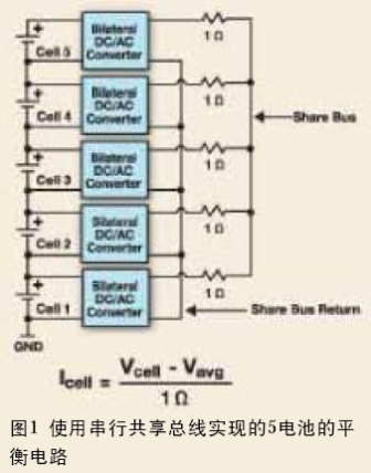 改善這種狀況的方法被稱為平衡。平衡是強制所有電池具有相同電壓的過程。這是通過平衡電路實現的。Aeroflex 平衡電路使用共享總線,這個總線的電壓等于所有電池的平均電壓。平衡電路由那些超過共享總線電壓的電池充電并將電能注入到電壓較低的電池,這個工作是通過高效率的雙邊DC/AC轉換器來完成的。平衡電流的大小與電壓差成正比,也就是說,隨著電池越來越接近理想平衡狀態,平衡電流將趨近于0。圖1顯示了一個用于5個電池的平衡電路,其中,1 Ω電阻確定了傳輸比,也就是不平衡電壓與平衡電流的比值。對于容量較大(通常20Ah或更高)的電池而言,為了將達到平衡的時間減到最短,需要高達1A的平衡電流。對這些應用而言,雙DC/AC轉換器電路通過平面變壓器工作在100kHz的頻率附近。