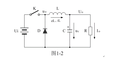 圖1-2是在圖1-1-a電路的基礎(chǔ)上,增加了一個整流二極管和一個LC濾波電路。其中L是儲能濾波電感,它的作用是在控制開關(guān)K接通期間Ton限制大電流通過,防止輸入電壓Ui直接加到負(fù)載R上,對負(fù)載R進行電壓沖擊,同時對流過電感的電流iL轉(zhuǎn)化成磁能進行能量存儲,然后在控制開關(guān)K關(guān)斷期間Toff把磁能轉(zhuǎn)化成電流iL繼續(xù)向負(fù)載R提供能量輸出;C是儲能濾波電容,它的作用是在控制開關(guān)K接通期間Ton把流過儲能電感L的部分電流轉(zhuǎn)化成電荷進行存儲,然后在控制開關(guān)K關(guān)斷期間Toff把電荷轉(zhuǎn)化成電流繼續(xù)向負(fù)載R提供能量輸出;D是整流二極管,主要功能是續(xù)流作用,故稱它為續(xù)流二極管,其作用是在控制開關(guān)關(guān)斷期間Toff,給儲能濾波電感L釋放能量提供電流通路。