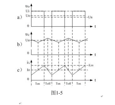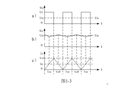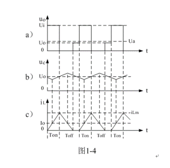 (3)當(dāng)Ui < 2Uo時,即:濾波輸出電壓Uo大于電源輸入電壓Ui的一半時,或控制開關(guān)K的占空比大于二分之一時:在K接通期間,雖然流過儲能電感L的電流上升率(絕對值),小于,在K關(guān)斷期間,流過儲能電感L的電流上升率(絕對值)。但由于Ton大于Toff,(1-5)式中i(0)和(1-11)式中iLX均大于0,即:電感存儲能量每次均釋放不完。在這種情況下,流過儲能電感L的電流iL是連續(xù)電流,開關(guān)電源工作于連續(xù)電流狀態(tài),輸出電壓Uo的紋波比較小,且濾波輸出電壓Uo大于濾波輸入電壓uo的平均值Ua。參看圖1-5。
