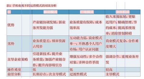在手機(jī)電視運(yùn)營模式上,應(yīng)以合作模式為主導(dǎo)模式,以移動(dòng)模式為次主導(dǎo)模式,不同運(yùn)營模式的對(duì)比分析見表1。