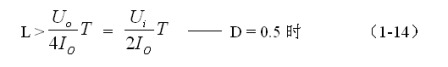 (1-13)和(1-14)式,就是計算串聯式開關電源儲能濾波電感L的公式(D = 0.5時)。(1-13)和(1-14)式的計算結果,只給出了計算串聯式開關電源儲能濾波電感L的中間值,或平均值,對于極端情況可以在平均值的計算結果上再乘以一個大于1的系數。