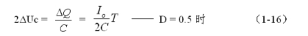 由圖1-6可以看出,在控制開關的占空比D等于0.5的情況下,電容器充、放電的電荷和充、放電的時間,以及正、負電壓紋波值均應該相等,并且電容器充電流的平均值也正好等于流過負載的電流。因此,電容器充時,電容器存儲的電荷ΔQ為: