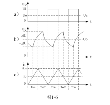 圖1-6是串聯式開關電源工作于臨界連續電流狀態時,串聯式開關電源電路中各點電壓和電流的波形。圖1-6中,Ui為電源的輸入電壓,uo為控制開關K的輸出電壓,Uo為電源濾波輸出電壓,iL為流過儲能濾波電感電流,Io為流過負載的電流。圖1-6-a)是控制開關K輸出電壓的波形;圖1-6-b)是儲能濾波電容C的充、放電曲線圖;圖1-6-c)是流過儲能濾波電感電流iL的波形。當串聯式開關電源工作于臨界連續電流狀態時,控制開關K的占空比D等于0.5,流過負載的電流Io等于流過儲能濾波電感最大電流iLm的二分之一。