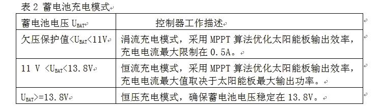 當系統檢測到環境光充足,控制器就會進入充電模式。蓄電池充電有兩個比較重要的電壓值:深度放電電壓和浮充充電電壓。前者代表在正常使用情況下蓄電池電能被用完的狀態, 而后者則代表蓄電池充電的最高限制電壓,這些參數應該從蓄電池產品手冊上可以查到。在設計電路中針對12V蓄電池,分別設置深度放電電壓為11V和浮充充電電壓為13.8V(皆為在室溫條件下的電壓值,軟件中這兩個值增加了相應的溫度補償),具體充電模式如表2所示。