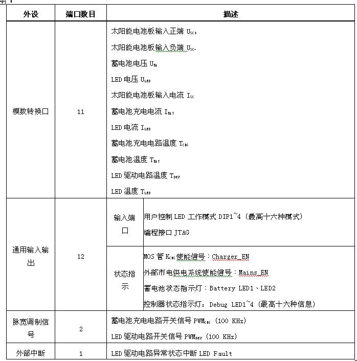 整個控制器的控制是通過一個MCU來實現,MCU的主要工作包括以下幾點:一是采用MPPT算法來優化太陽能電池板工作效率;二是針對蓄電池不同狀態采用合適的充電模式;三是保證LED驅動電路的恒流輸出;四是判斷白天黑夜并以此來切換蓄電池充電和放電模式;最后就是提供監控保護、溫度監測、狀態輸出和用戶控制輸入檢測(DIP1~4)等功能。MCU的選擇最主要是滿足ADC、GPIO和外部中斷的需要,不需要單純追求速度。表1列出了實際電路中MCU外圍設備的使用情況,考慮到以后擴展的需要,主控芯片使用STM32F101RXT6 (意法半導體最新款STM32系列MCU,采用Cortex-M3內核)。