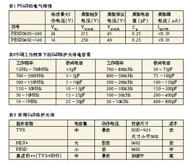 ESD元件最重要的參數是電容量。一般MLV的電容量是40~220pf,E系列的電容量是3~12pf;而PESD的電容量僅為0.25pf。